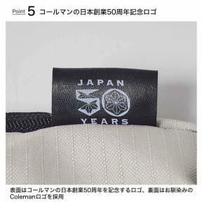 デザインはナチュラルカラーの生地に白ロゴをあしらう。コールマンの日本創業50周年記念タグもポイントという。