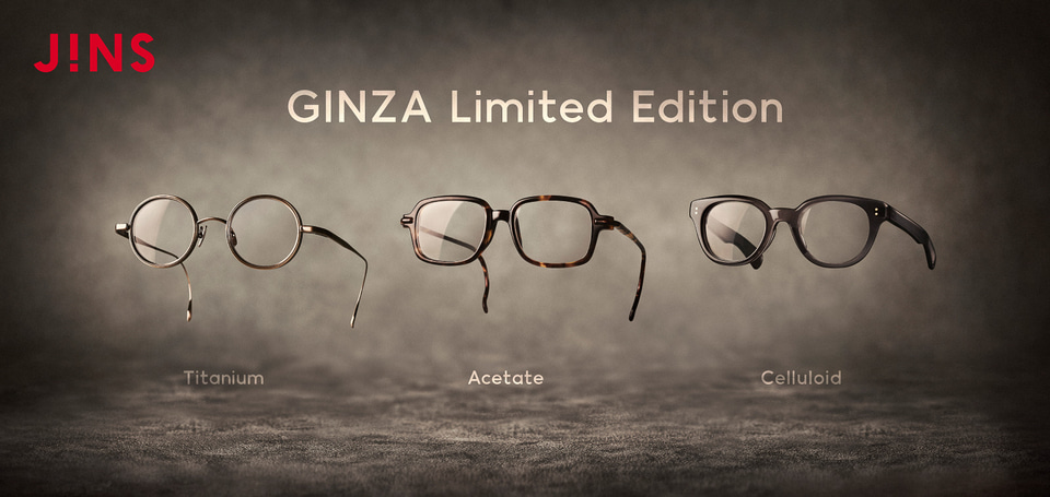 JINS 銀座、開業記念の限定モデル。セルロイド・アセテート・チタンの6型18種、丁番などに砂紋刻む