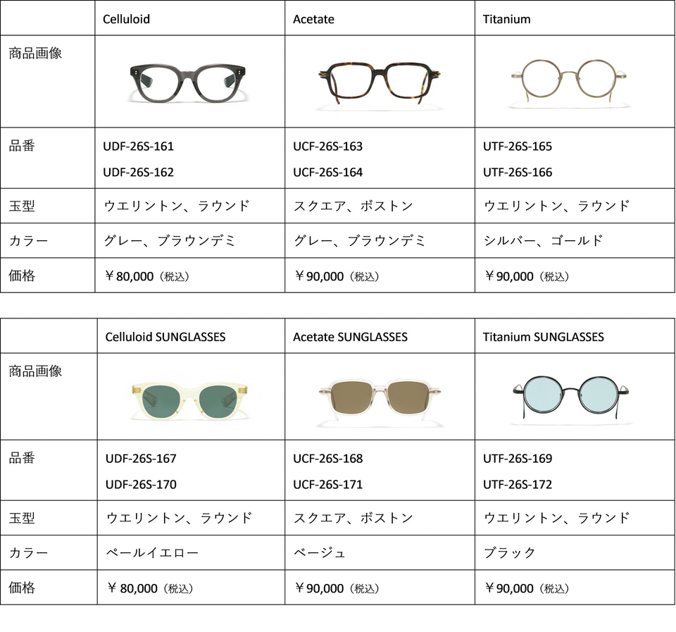 フレームの素材はセルロイド(ウエリントン、ラウンド)、アセテート(スクエア、ボストン)、チタン(ウエリントン、ラウンド)の3種あり、それぞれが2型のシェイプを用意する。また、この全6型すべてにサングラス版も設定している。価格はセルロイドが8万円、アセテートとチタンが9万円(いずれも標準クリアレンズ代込み)。