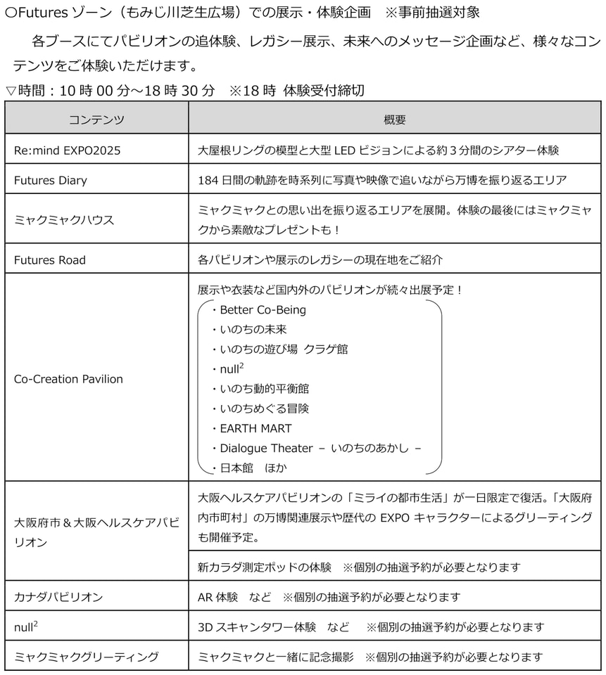 [Futuresゾーン]事前抽選による入場、一部の体験プログラムは当選者のみ