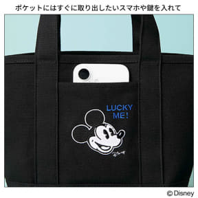 特別付録は、セレクトショップ「Shinzone(シンゾーン)」とミッキーマウスの両A面トートバッグ。オールブラックの本体に、ミッキーとシンゾーンのロゴをロイヤルブルーカラーで刺繍したプレッピーなデザインで、ミッキー側には便利なフロントポケットも備える。