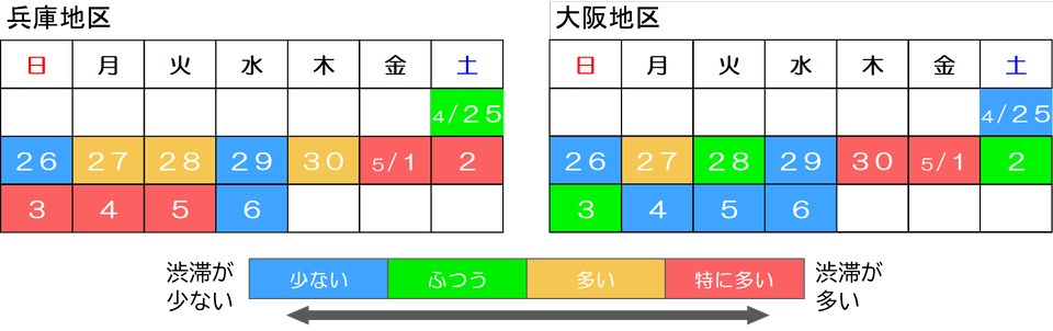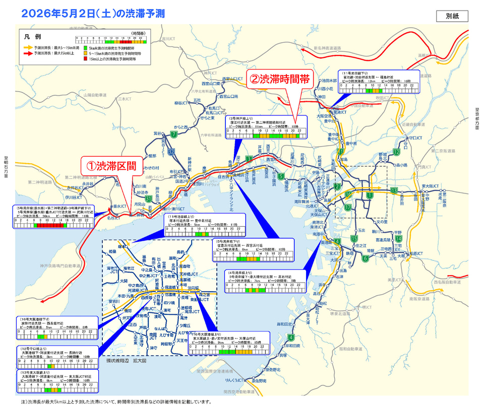 阪神高速は、ゴールデンウィーク期間中(4月25日~5月6日)の渋滞予測を発表した。