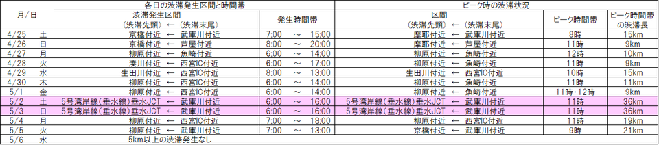特に3号神戸線では激しい渋滞を予測しており、姫路方面の3号神戸線(西行)では、5号湾岸線(垂水線)垂水JCT~武庫川付近で5月2日と3日の6時~16時にピークを迎える見込み。両日とも、11時ごろは渋滞長が最長で約36kmにおよぶ可能性がある。
