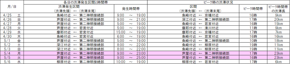 一方、大阪方面の3号神戸線(東行)については、芦屋付近~第二神明道路接続部において、5月4日9時~23時、5日9時~25時を渋滞ピークと予想している。予想される最大渋滞長は、4日が17時ごろに約23km、、5日が16時ごろに約23km。