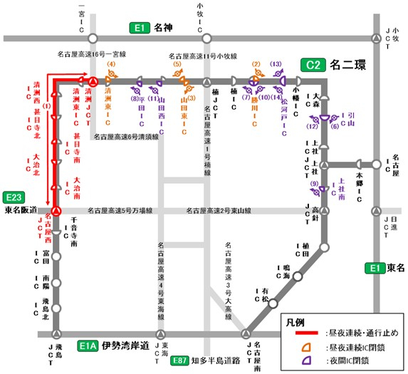 このうち名二環 清州JCT~名古屋西JCT間(外回り)では、4月7日2時~16日24時に昼夜連続通行止めを実施。東名阪道 名古屋西IC~亀山IC間(上下線)では4月5日0時~24日6時(土曜6時~日曜を除く)に車線規制を行なう。また、日によっては一部IC/PAを閉鎖する。