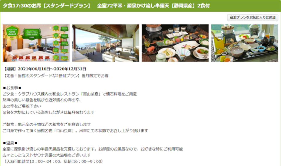 熱海の高台に立つ温泉宿「熱海倶楽部 迎賓館」(静岡県熱海市伊豆山1171)では、1泊2食付きスタンダードプランを販売中。全室70m2以上で、100%源泉かけ流し温泉の半露天風呂と専用バルコニーを完備しており、通常価格は1人あたり3万8500円~(1室2名利用の場合)。