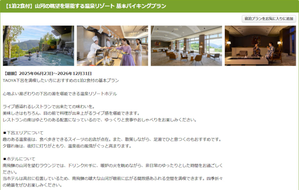 大江戸温泉物語グループの「TAOYA下呂」(岐阜県下呂市森1781)では、1泊2食付き基本バイキングプランを販売中。1室2名利用の場合、通常価格は1人あたり2万1300円〜。