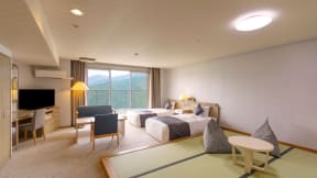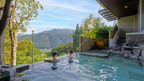 南飛騨の山々と河に囲まれた眺望自慢の宿で、大浴場と露天風呂は豊かな緑を望む「深層の湯」と下呂温泉街の夜景も美しい「層雲の湯」を男女入れ替えで楽しめる。