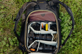 バックパックは、容量を拡張できるロールトップ構造や豊富なポケットなどにより高い収納力を備える。別売りのカメラキューブやパッキングキューブ、各種ポーチ類などの「パッキングツール」を活用することで、衣類や食料、キャンプ道具からスポーツ用品、撮影機材などの収納に対応する。雨天に備えて、別売りのレインカバー「レインフライ」も各サイズ用意している。
