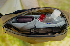 スリングバッグは超軽量ながらも十分な収納力を持ち、7L/4Lは別売りのカメラキューブと組み合わせることで、アウトドア向けのコンパクトなカメラバッグとして使用できる。