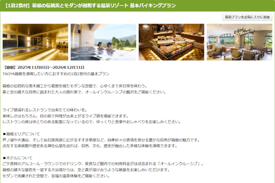 大江戸温泉物語グループの「TAOYA箱根」(神奈川県足柄下郡箱根町仙石原1246)では、1泊2食付き基本バイキングプランを販売中。1室2名利用の場合、通常価格は1人あたり2万6300円~。