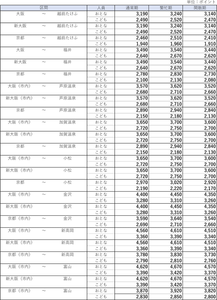 所定運賃の約75%オフ相当のWESTERポイントで、特急「サンダーバード」号のグリーン車と北陸新幹線「つるぎ」号のグランクラスがお得に利用できるきっぷ。区間や時期によって必要ポイント数は異なり、グランクラスで使えるポイント商品は初登場となる。