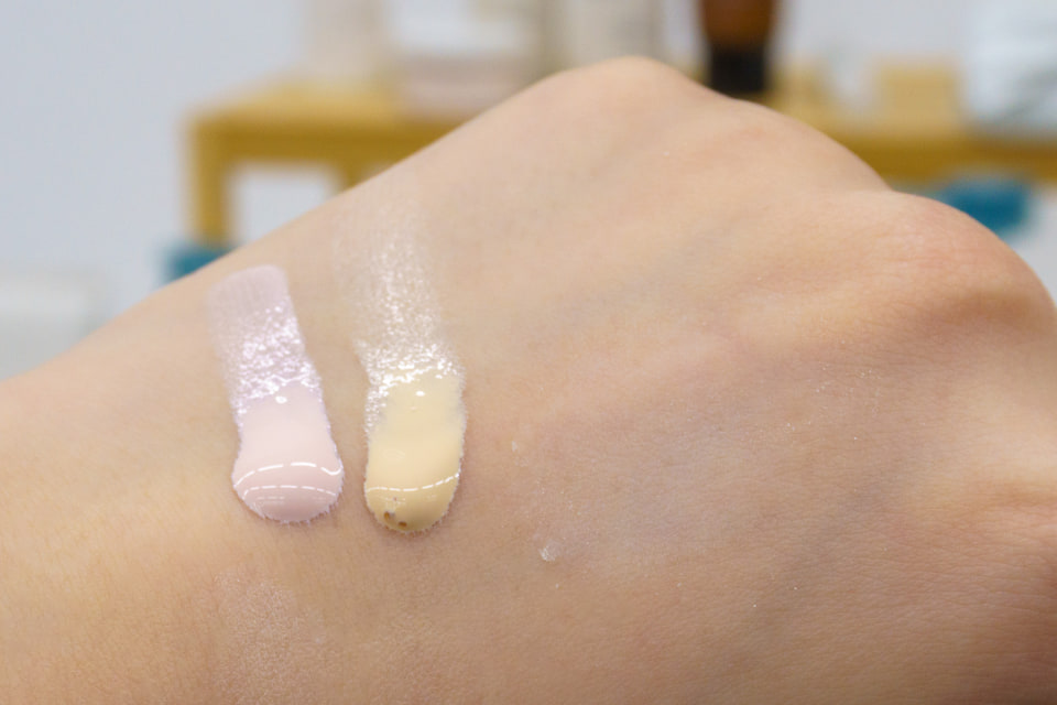 皮脂を吸着して肌のテカリをおさえるパウダーや、うるおい成分としてセラミドと5種のアミノ酸(アラニン、アルギニン、グルタミン酸Na、セリン、プロリン)を配合。紫外線吸収剤フリーかつパール材も含まれておらず、手の甲に使ってみてもほとんど色は付かなかった。