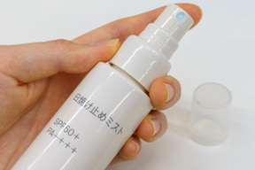 パウダーと同じくSPF50+/PA++++で、耐水性もある「日焼け止めミスト」(70mL 890円)は、顔や身体だけでなく、髪にも使えるとのこと。ミストはかなり細かく、べたつきもあまり気にならなかった。アルコールフリーだが、顔に使う場合は直接噴射せず、一度手に取ってから塗り広げよう。