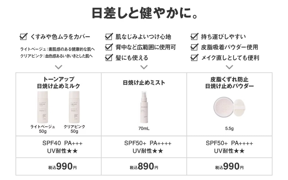 無印良品の日焼け止め、天然由来成分100%のミストや皮脂くずれ防止パウダーが登場。身体に使えるトーンアップミルクも
