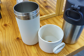 結露しにくく、冷たさが長持ちする真空二重構造を採用。内側は金属臭をおさえ、飲みもの本来の香りを楽しめるセラミックコーティングを施している。実際に同社のペットボトルの麦茶を注いで飲んでみると、ステンレス素材の匂いは気にならず、淹れたての麦茶に近い香りを体感できた。