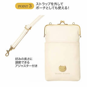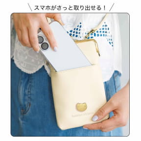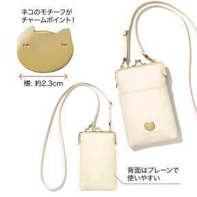 サイズは約12×2×19cm(幅×奥行×高さ)で、スマホがサッと取り出せる前ポケット付き。ワンタッチで開閉できるがま口スペースの内装は、ねこと花畑をデザインした華やかなテキスタイルになっている。