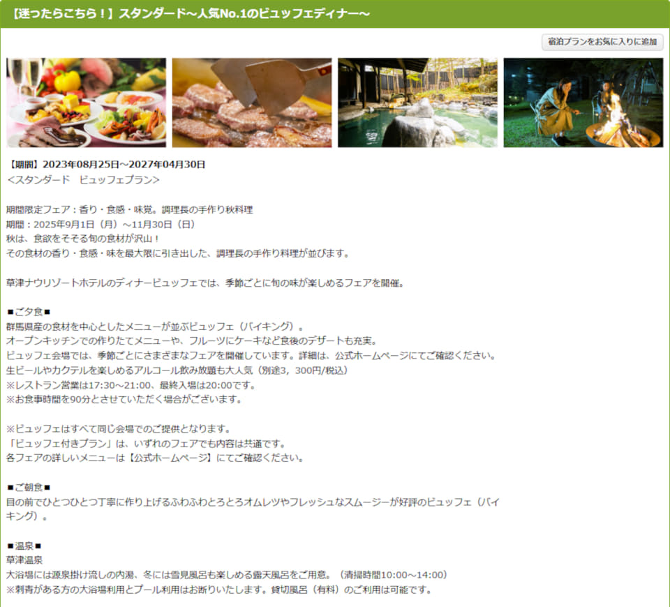 草津温泉にある「草津ナウリゾートホテル」(群馬県吾妻郡草津町草津白根750)では、1泊2食スタンダードビュッフェプランを販売中。露天風呂付客室を1室2名利用の場合、通常価格は1人あたり2万5500円~。