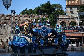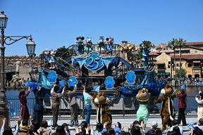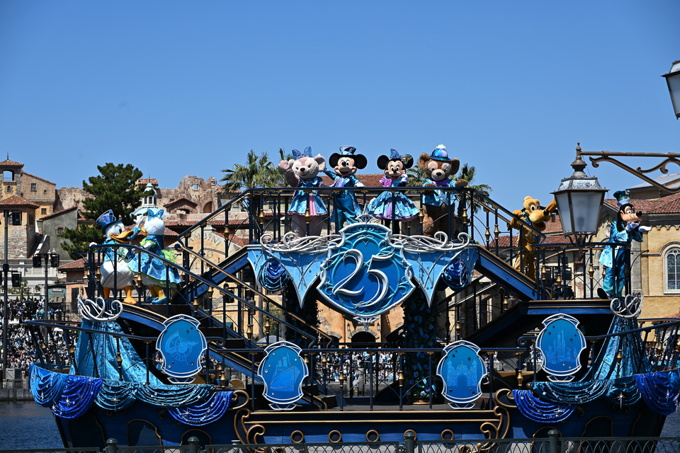 さまざまな海の魅力から着想を得たテーマカラー“ジュビリーブルー”を採用した、特別なコスチュームに身を包んだミッキーマウスやダッフィー&フレンズらディズニーの仲間たちが、各テーマポートの楽曲とともに船に乗って水上に登場。