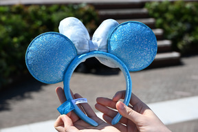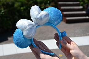 そしてこちらも外せないのがカチューシャ(2400円)。キラキラと輝くスパンコールが耳の全面に散りばめられ、祝祭感満載! 専用ホルダーに吊り下げてもワンポイントとしてサマになる。