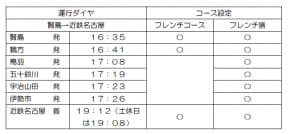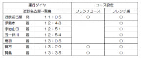 運行スケジュールは1日1往復の週6日(季節によって週7日)で、停車駅は近鉄名古屋・伊勢市・宇治山田・五十鈴川・鳥羽・鵜方・賢島。このうちフレンチコースの設定は、下りが近鉄名古屋発→鵜方・賢島着のみ、上りが賢島・鵜方発→近鉄名古屋着のみとしている。