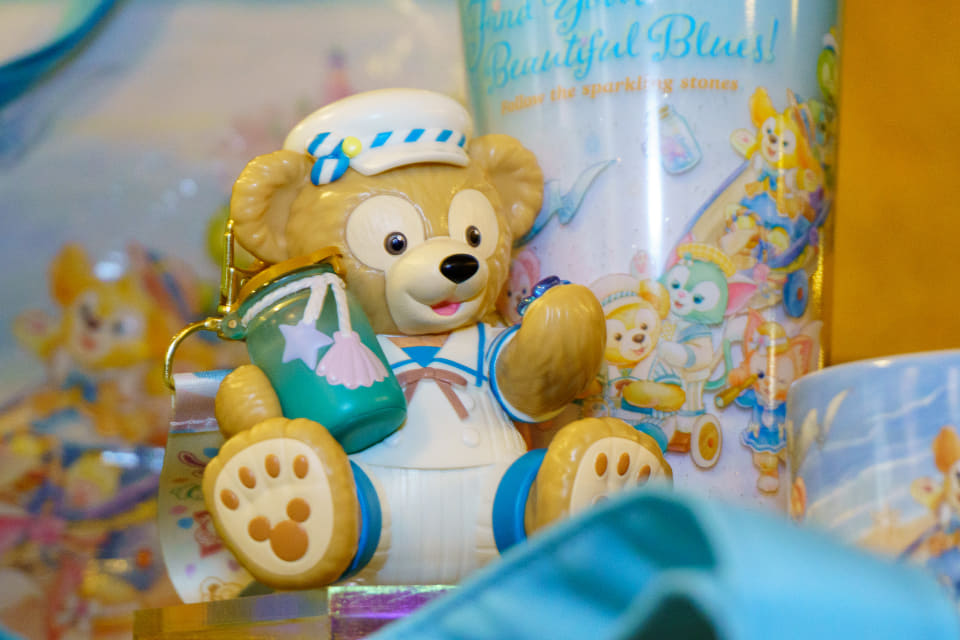 砂浜で見つけたきらきら光る石たちを、ダッフィーがビンに集める姿をフィギュア化したミニスナックケース(1700円、グミキャンディー付き)も見逃せない。