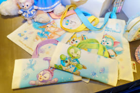新作グッズは、ダッフィー&フレンズらしい優しいブルーを取り入れた雑貨が豊富。ぬいぐるみバッジ(2800円)やトートバッグ(1500円)をはじめ、パークで身につけて楽しめるカチューシャ(2500円)、バッジやキーホルダーとして使えるお顔付きの「クリップ」(2300円)、デニム調のキャップ(3500円)などを取りそろえている。