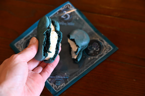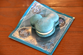 続いては、「スパークリング・ジュビリーワゴン」にて販売のミッキーマカロン ホワイトチョコ(650円)。こちらキラキラと艶感のあるマカロン生地にたっぷりとホワイトチョコベースのクリームをサンドと、サイズ感とともにビジュアル抜群のスイーツだ。頬張ると、スミレの香りがふんわり、とってもロマンティック!