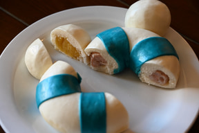 もう一品、絶対に外せない限定メニューを紹介しよう。それがスペシャルうきわまん エビ&さつまいも(900円)。浮き輪のデザインにジュビリーブルーを加えて、25周年だけのフレーバーにアップデート中。耳部分にスイートポテト、うきわ部分はエビの餡と2つのフレーバーが1つで。まさに甘いと塩味の無限ループにハマる味わいだった。