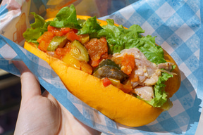 「スペシャルセット」(1530円、メイン単品990円)は、スペシャルラタトゥイユサンド(ハム&ハニーマスタード、たまごサラダ)に、フレンチフライポテトとお好みのソフトドリンクが付き、しっかりランチや手軽な夕食としてお勧めだ。サンドの包み紙はレミーの世界観を表現したポップなデザインとなっている。