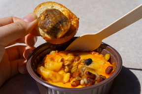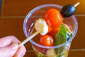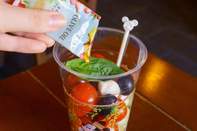 ミニトマトとオリーブは素材の味そのままなので、バジルは香りを立たせるために多少つぶして、別添えのオリーブオイルもしっかり全体にかけよう。付属のピックだとかなり食べにくかったので、フォークまたはスプーンをもらうのがベター。