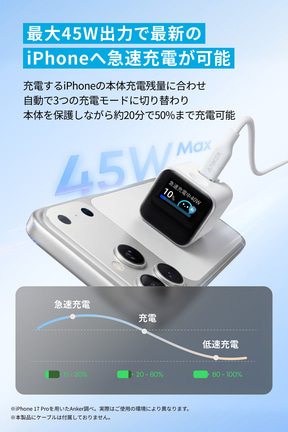 90°と180°で展開するスイング式のコンセントプラグと充電状況などを表示するディスプレイを備える充電器で、最大45W出力のUSB Type-Cポートを1系統搭載している。