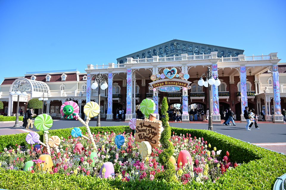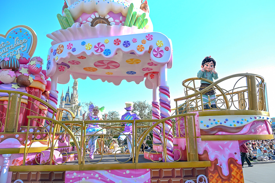 1日1回、パレードルートでは「イッツ・ア・スウィーツフルタイム!」を上演。映画「シュガー・ラッシュ」のヴァネロペが思い描いた、かわいくてカラフルなお菓子でつくられたリゾートが目の前に広がる。