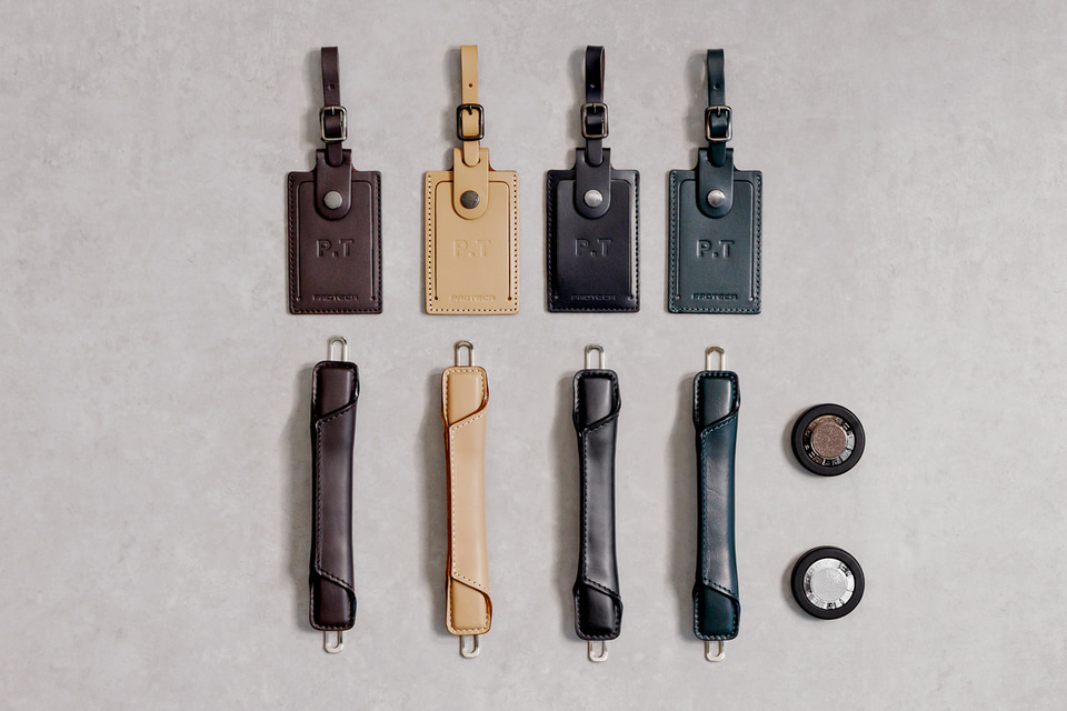 ブラウン、ナチュラル、ブラック、ダークグリーンの全4色展開。ラゲージタグはアルファベット3文字までのイニシャル刻印に対応
