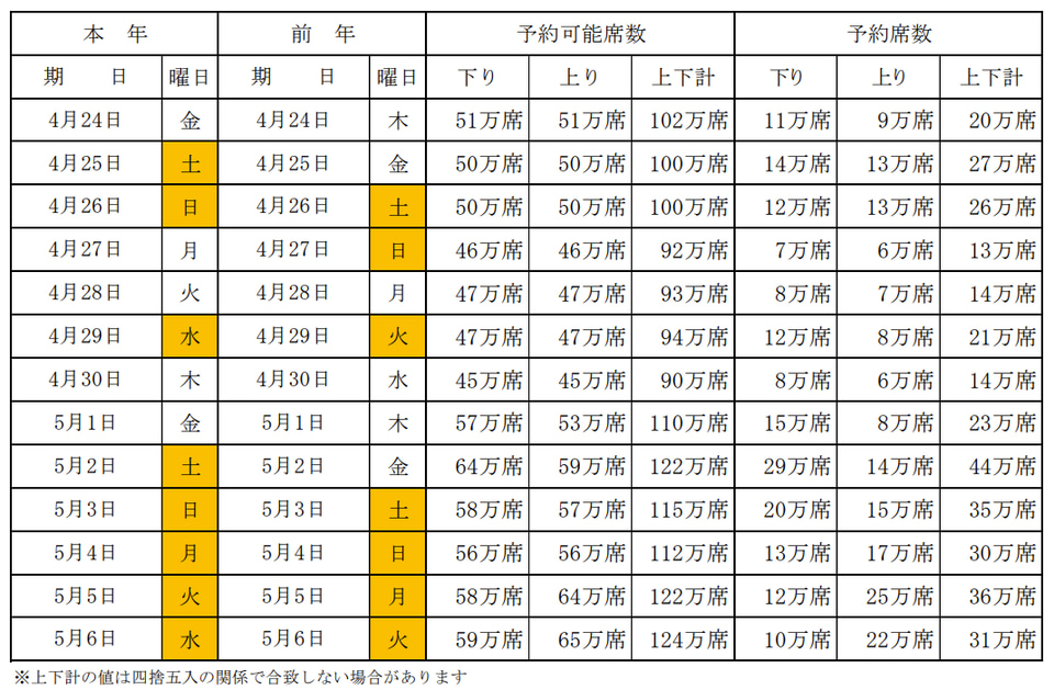 4月24日~5月6日の13日間におけるJR6社の指定席予約席数は、4月9日時点で次のとおり。新幹線・在来線ともに供給座席数と予約席数は前年以上。