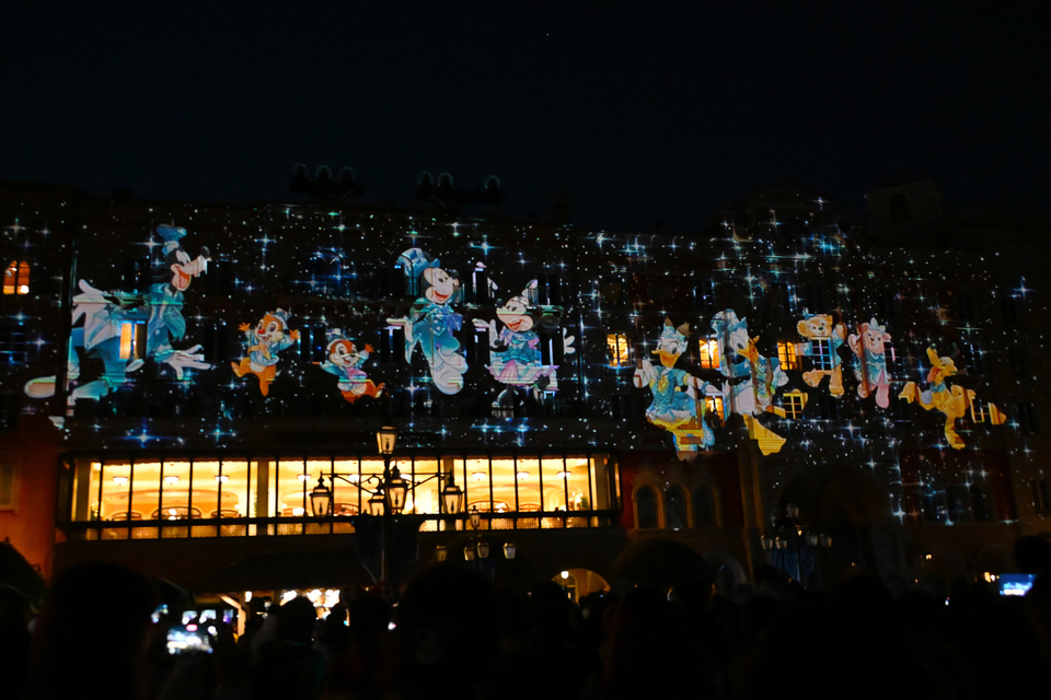 25周年のテーマソング「Come Join the Jubilee」とともに、各ポートや東京ディズニーシーならではのモチーフ、さらにディズニーキャラクターたちが浮かび上がる、その幻想的な空間にうっとり。