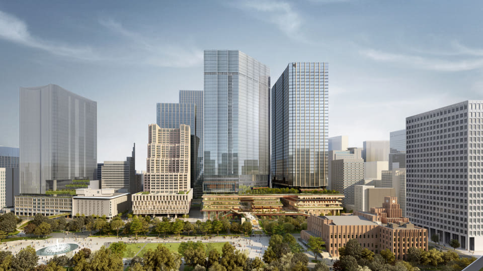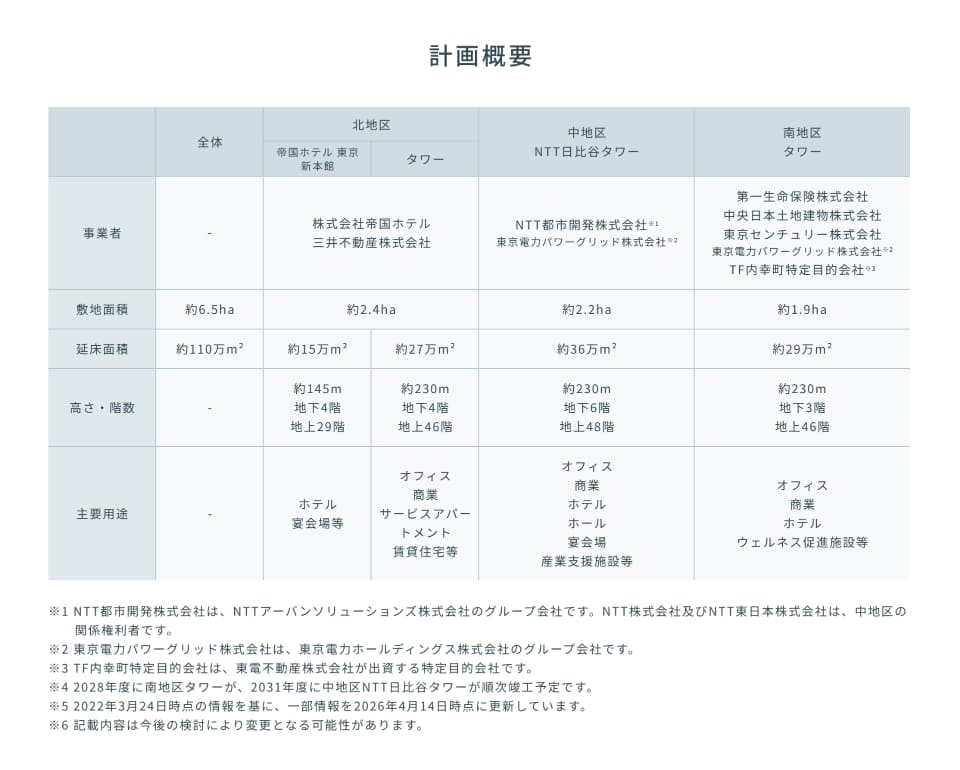 同プロジェクトは北地区・中地区・南地区の3地区からなり、オフィス、商業施設、ホテルなどを備える延床面積約110万m2の都心最大級の複合開発。全体完成へ向けて、2028年度には南地区のタワーが、2031年度には中地区のNTT日比谷タワーが順次竣工する予定となっている。