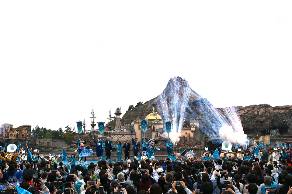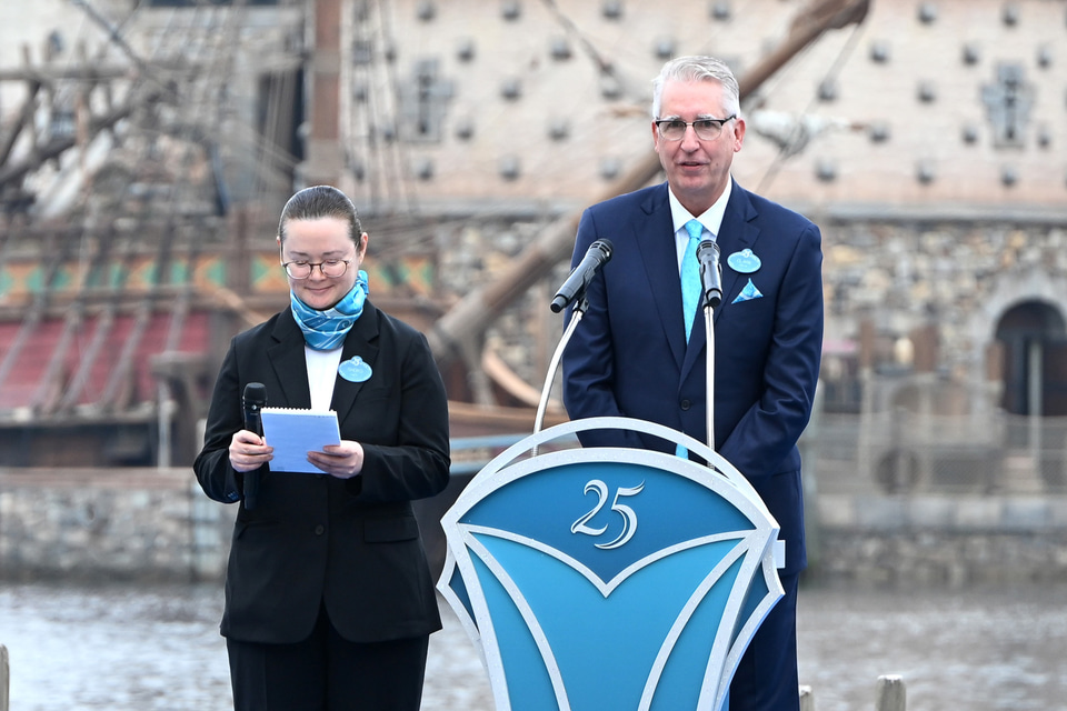 「東京ディズニーシーは、日本の皆様に、いまだ体験したことのない感動をお届けしようとオリエンタルランドとディズニーが共同で取り組んだ世界に一つのオリジナルのパークです。私たちは東京ディズニーランドとは異なる魅力を8つのテーマポートに託しました、これからもみなさまの心に、冒険とイマジネーションの心が輝き続けますように。さぁみなさま、“ジュビリーブルー”にきらめく海へ出航しましょう! 東京ディズニーシー25周年“スパークリング・ジュビリー”、開幕です!」とした。