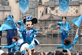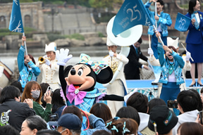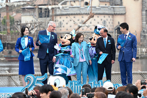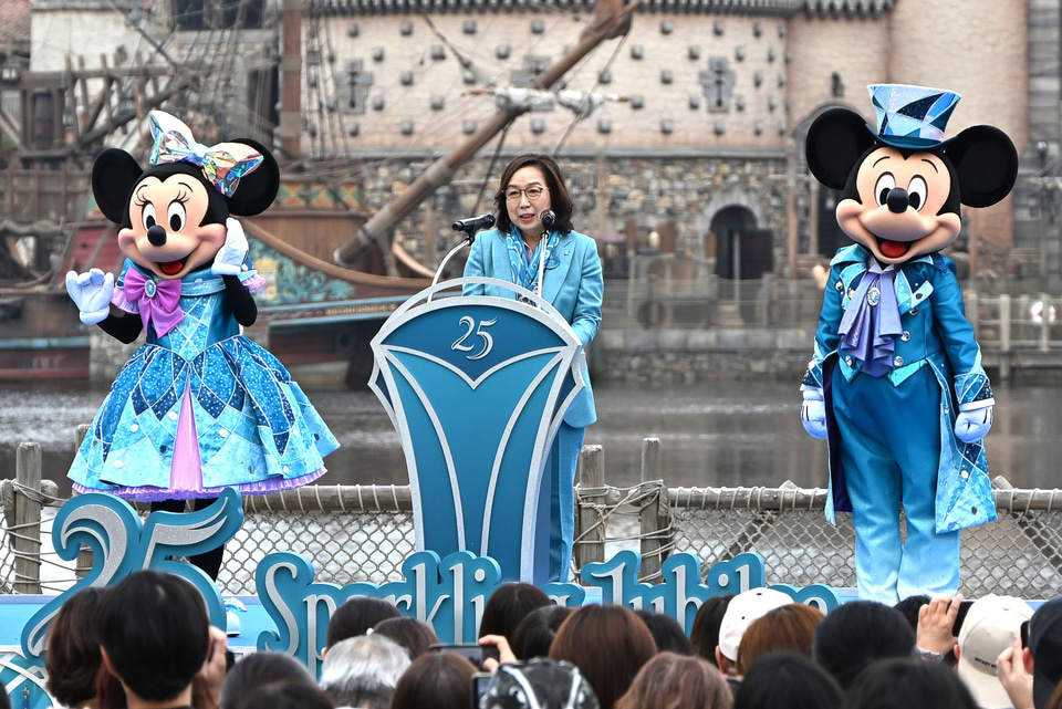 セレモニーの後半では、25周年のテーマカラー“ジュビリーブルー”を基調とした新衣装に身を包んだミッキーマウスとミニーマウスがステージに! そして、オリエンタルランド 代表取締役会長 兼 CEOの髙野由美子氏が開会宣言を行なった。