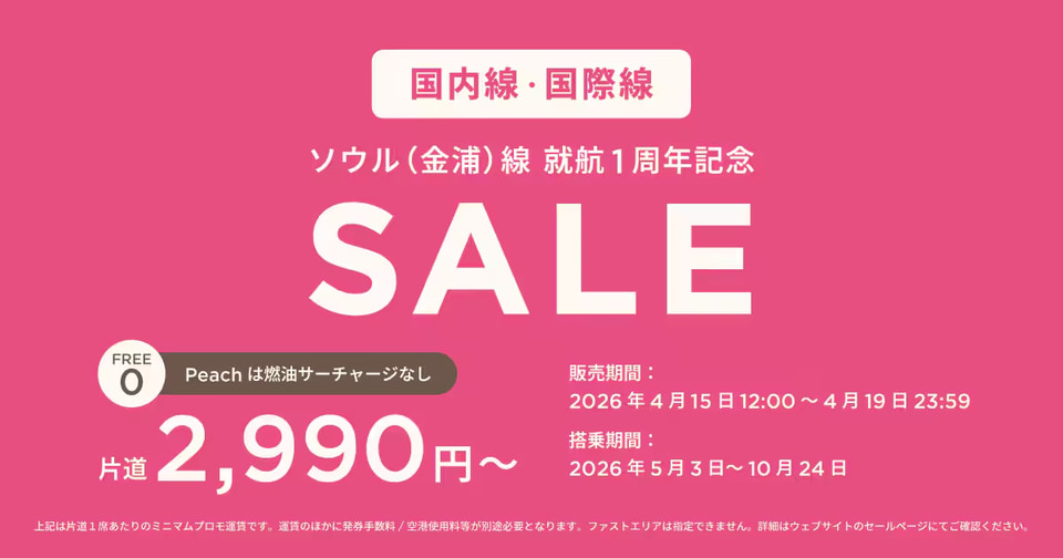ピーチ(Peach Aviation)は、国内線・国際線が対象の「ソウル(金浦)線就航1周年記念セール」を4月19日23時59分まで実施している。対象搭乗期間は5月3日~10月24日。