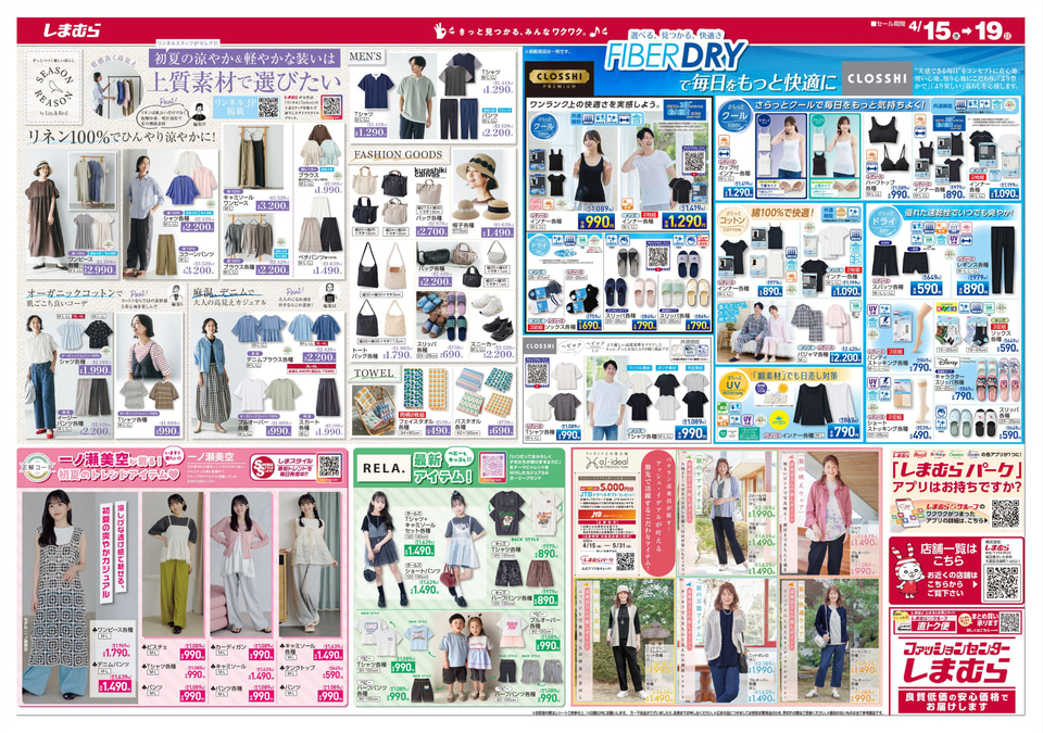 そのほか、初夏にお勧めのトレンドアイテムを集めた、一ノ瀬美空さんが着る「正解コーデ」や、しまむらオリジナルブランド「SEASON REASON by Lin.&Red(シーズンリーズン バイ リンアンドレッド)」の新作アイテムなども登場。詳細は各店舗のチラシを確認いただきたい。
