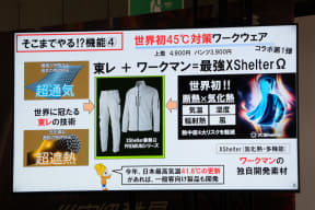 さらに今シーズン、東レの技術を組み合わせて新たに開発した暑熱緩和素材「XShelter 暑熱Ω(オメガ)」が初登場。これを用い、外気温が45℃でも仕事や活動ができるワーク兼アウトドアウェアを新発売する。