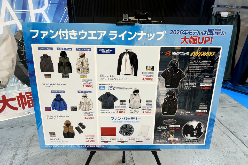 新作ラインアップは、風量を増強してさらに涼しくなったファン付きウェアや、独自開発の断熱素材XShelterを用いた暑熱軽減ウェア、昨夏“不審者パーカー”として話題を集めたフルフェイスガート仕様の女性用UVカットウェアなど。順次店頭での販売をスタートしている。