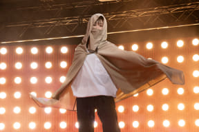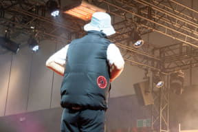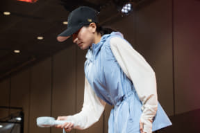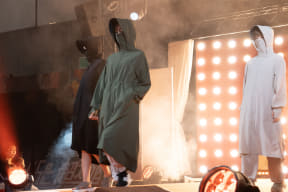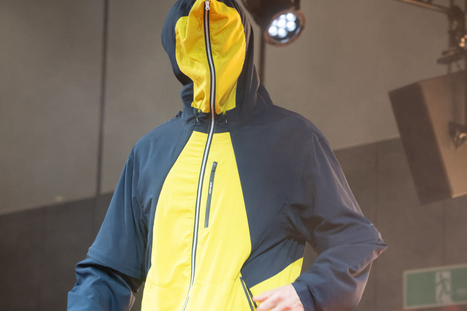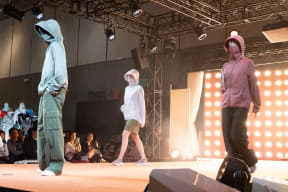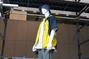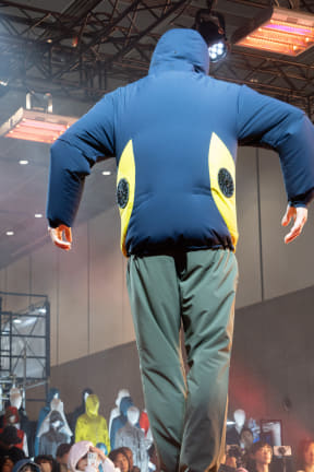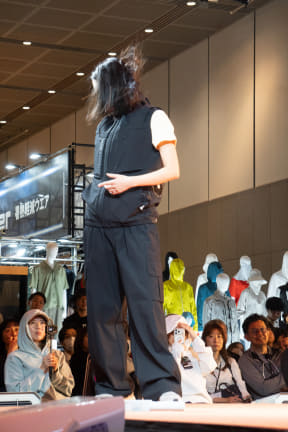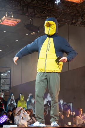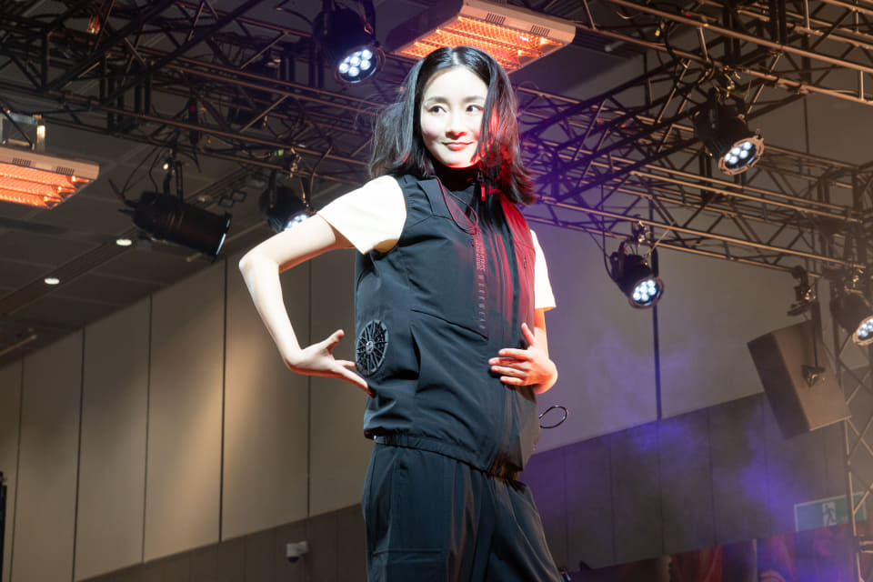この日のイベントでは、近い将来想定される“災害級の気温45℃”という極限環境のなかで生存できるか?をテーマにファッションショーを実施。じりじりと肌を焼くような暑さ45℃をステージ上で再現し、今季新作を着こなした男女モデルがランウェイに登場した。