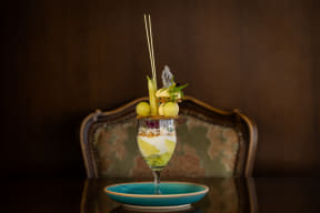 上品な甘みと芳醇な香りが特徴の静岡県産マスクメロンを贅沢に使用したパフェ。グラスの中には、地元食材を活かした静岡紅茶のサブレや丹那ヨーグルトのムースをはじめ、濃厚なチーズプリン、カリッと食感のシュトロイゼル、削ったホワイトチョコレート、バニラアイスにタピオカのチュイルなど、異なる食感と風味をいくつも重ね、初夏の爽やかさを感じられる一品に仕上げている。