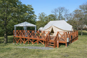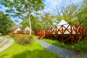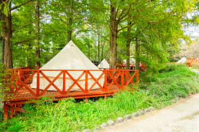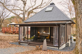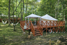 グランピングは、大型のノルディスク製ヴァナヘイムテントで広々としたスペースが魅力の「ファミリースイート」をはじめ、「こもれびテラス」や「ハンモックテラス」など4タイプ。