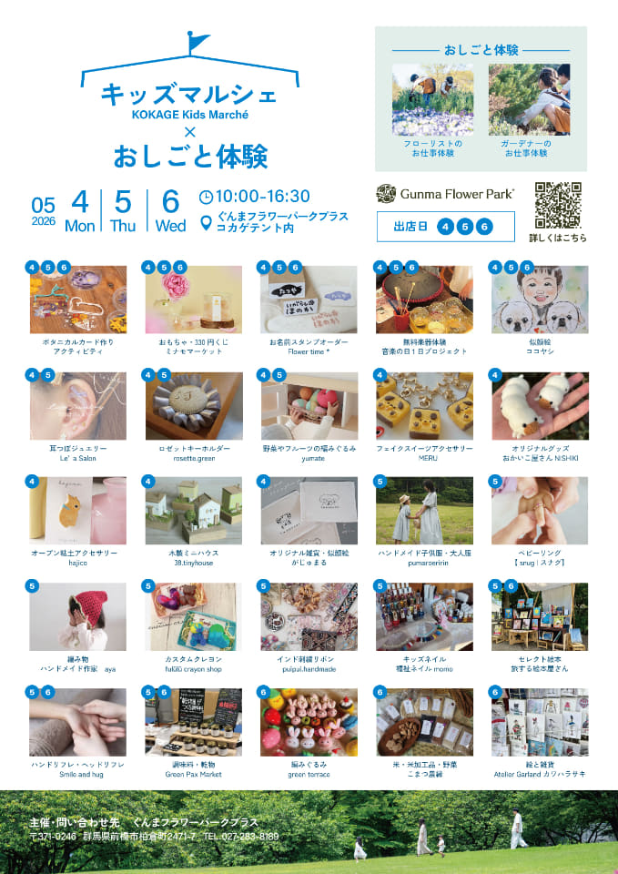 期間中はツツジやスプリングブーケガーデンが見頃になる予想で、こどもの日の前後(5月4日~6日)には、延べ約40店舗が出店するメインイベント「コカゲキッズマルシェ」を開催。手作り雑貨やベビー・キッズアイテムの販売、楽器体験やリフレ・ネイル体験など、親子で一緒に楽しめるブースが揃う。