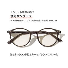 サングラスはUVカット率99.9%で、ほどよいラウンド型とカーキブラウンのフレームが特徴。室内ではクリアに、屋外では濃いブラウンにレンズの色が変化する。誰にでもなじみやすく軽やかな着け心地なので、ちょっとしたお出かけやお散歩にもお勧めという。