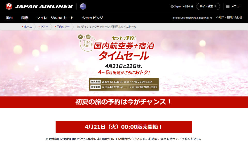 JAL、国内航空券+宿泊タイムセール。4~6月出発のお得プラン、4月21日0時から販売