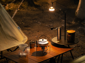 付属のランタンハンガーを付ければ、前かがみにランタンを吊るして手元周辺を照らすことができる。独自の2WAY構造で垂直に立ててテーブル全体を照らすことも可能。